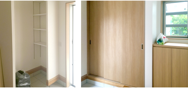 | 玄関ドアの前に、広々としたエントランスが印象的なH様邸。雨や日差しから守られたこの空間は、小さなお子様を連れてのお出かけや、大きな荷物を持っての帰宅時にとても便利です。ベビーカーなど、「室内には入れらないけど雨や日差しのあたる場所には置きたくない。」というものをちょっと置いておくのに良いですよね。 |